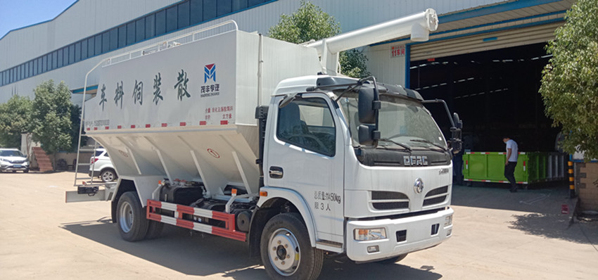 散裝飼料運(yùn)輸車,散裝飼料車的飼料罐架設(shè)在卡車的底盤上,罐頂開有進(jìn)料口.頂部的一根螺旋輸送卸料管(俗稱卸料絞龍)則可自由回轉(zhuǎn)和抬升,抬升的仰角可達(dá)60度。運(yùn)輸時(shí),頂部的螺旋管平臥在罐頂;卸料時(shí)則抬起,使管端的出料口與畜禽飼養(yǎng)場(chǎng)貯料罐頂部的進(jìn)料門相接,駕駛室內(nèi)裝有操縱裝置(操縱裝置也可裝置在罐體尾部),卸料時(shí)通過車底的動(dòng)力輸出軸和減速器來驅(qū)動(dòng)螺旋,以完成卸料。