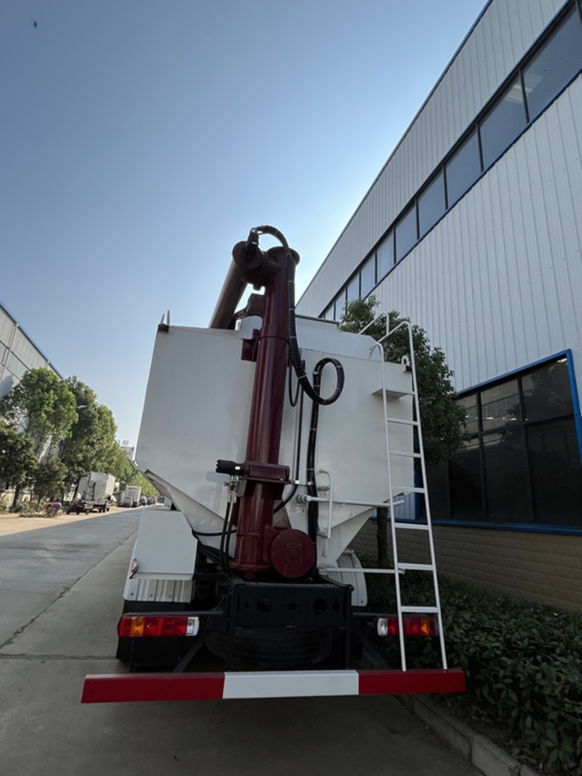 散裝飼料運(yùn)輸車(chē),散裝飼料車(chē)的飼料罐架設(shè)在卡車(chē)的底盤(pán)上,罐頂開(kāi)有進(jìn)料口.頂部的一根螺旋輸送卸料管(俗稱(chēng)卸料絞龍)則可自由回轉(zhuǎn)和抬升,抬升的仰角可達(dá)60度。運(yùn)輸時(shí),頂部的螺旋管平臥在罐頂;卸料時(shí)則抬起,使管端的出料口與畜禽飼養(yǎng)場(chǎng)貯料罐頂部的進(jìn)料門(mén)相接,駕駛室內(nèi)裝有操縱裝置(操縱裝置也可裝置在罐體尾部),卸料時(shí)通過(guò)車(chē)底的動(dòng)力輸出軸和減速器來(lái)驅(qū)動(dòng)螺旋,以完成卸料。