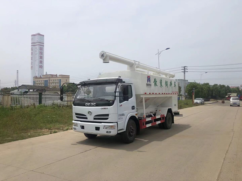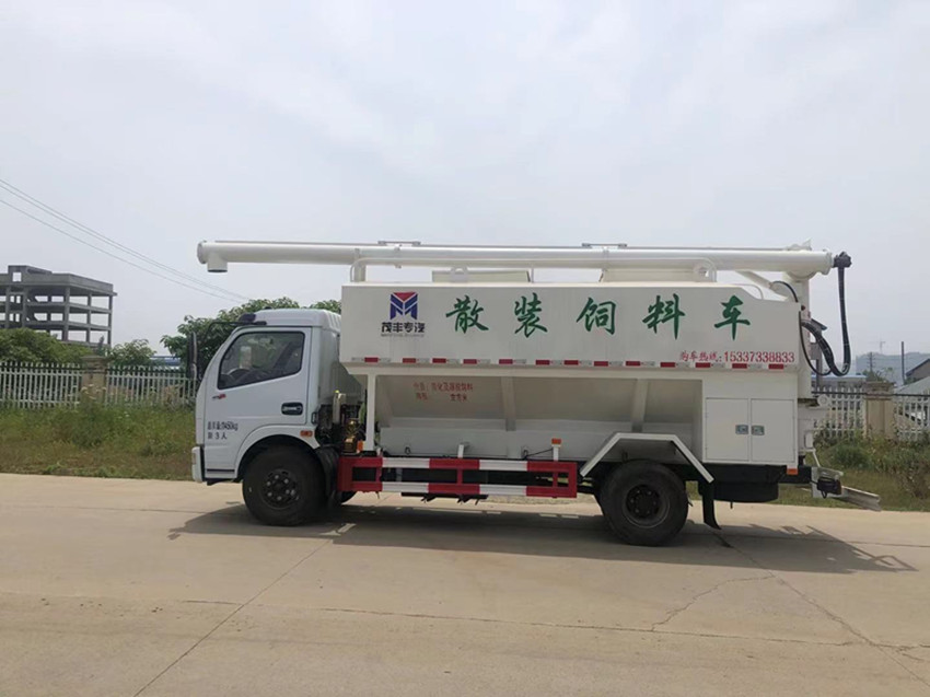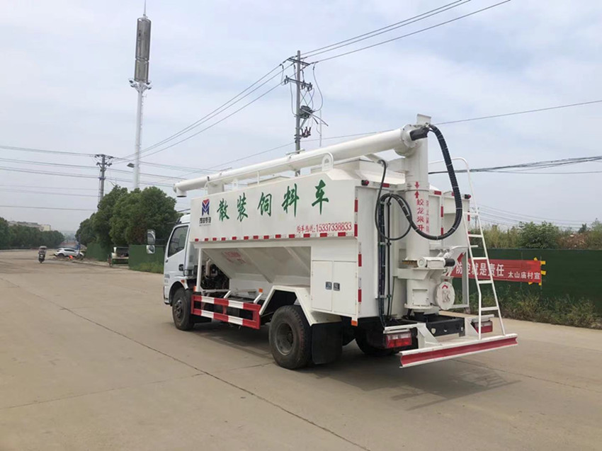 散裝飼料運輸車,散裝飼料車的飼料罐架設(shè)在卡車的底盤上,罐頂開有進料口.頂部的一根螺旋輸送卸料管(俗稱卸料絞龍)則可自由回轉(zhuǎn)和抬升,抬升的仰角可達(dá)60度。運輸時,頂部的螺旋管平臥在罐頂;卸料時則抬起,使管端的出料口與畜禽飼養(yǎng)場貯料罐頂部的進料門相接,駕駛室內(nèi)裝有操縱裝置(操縱裝置也可裝置在罐體尾部),卸料時通過車底的動力輸出軸和減速器來驅(qū)動螺旋,以完成卸料。